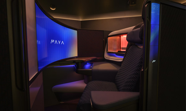 MAYA a été étudiée pour apporter une ergonomie et un confort maximal au fauteuil passager. Elle intègre ainsi la technologie Arise qui optimise automatiquement la pression des coussins, régule la température et réduit les pics de vibrations pendant le vol, facilitant le repos des passagers. En dehors de ces périodes, ils pourront se tourner vers l’ultra-haute définition d’un écran OLED Astrova Curve de 45 pouces, combiné à un système audio sans casque pour profiter du système de divertissement en vol, qui permet une immersion dans les programmes et une importante personnalisation. Ken Sain, le PDG de Panasonic Avionics, affirme que, ainsi, « MAYA offre une expérience visuelle 50 % plus immersive que si l’on était assis dans une salle de cinéma. »