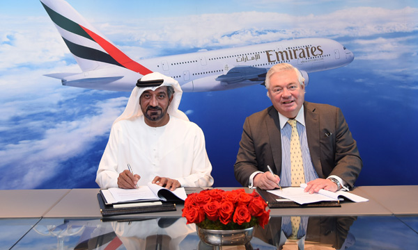 La compagnie Emirates vient de signer un protocole d’accord (MoU) pour acquérir jusqu’à 36 nouveaux Airbus A380 (20 appareils fermes et 16 options). L’accord, valorisé à 16 milliards de dollars au prix catalogue de l’avionneur, a été signé aujourd’hui à Dubaï par le cheik Ahmed bin Saeed Al Maktoum, président d’Emirates Group et par John Leahy, le directeur des Ventes d’Airbus. Les nouveaux appareils sont livrables à partir de 2020.