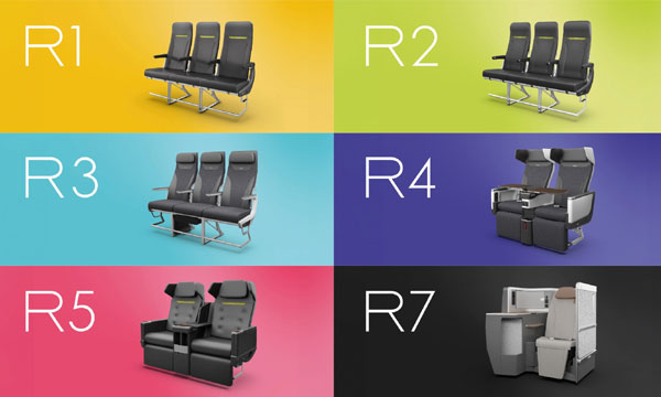 Ainsi, les fauteuils de classe économique court et moyen-courrier SL3710 et BL3710 deviennent les R1 et R2, le siège de classe économique moyen et long-courrier CL3810 devient le R3, le fauteuil de premium economy PL3810 devient le R4, le CL4710 de classe affaires devient le R5 et le lie-flat de classe affaires CL6720 devient le R7.