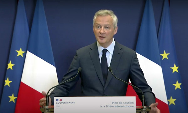 L’Etat a désormais « décrété l’état d’urgence pour l’industrie aéronautique ». Constatant les vacillements d’un secteur qui jusqu’à présent « ne connaissait pas la crise », le gouvernement, par la voix du ministre de l’Economie et des Finances, a présenté le 9 juin son plan de soutien en faveur de la filière. Le but est « d’éviter tout décrochage », qui mettrait en jeu la survie de 1 300 entreprises, 300 000 emplois et une contribution positive de 34 milliards d’euros à la balance commerciale de la France. Bruno Le Maire a ainsi promis un effort de 15 milliards d’euros, dont font partie les 7 milliards d’euros de soutien à Air France-KLM.