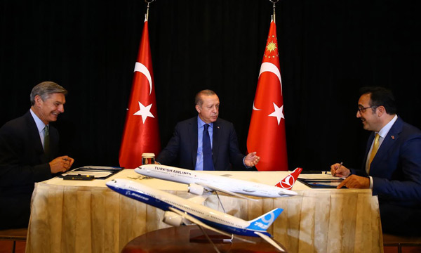 L’accord a été signé par İlker Aycı, le président de Turkish Airlines et par Ray Conner, vice-président de Boeing, en présence du président turc (photo).
