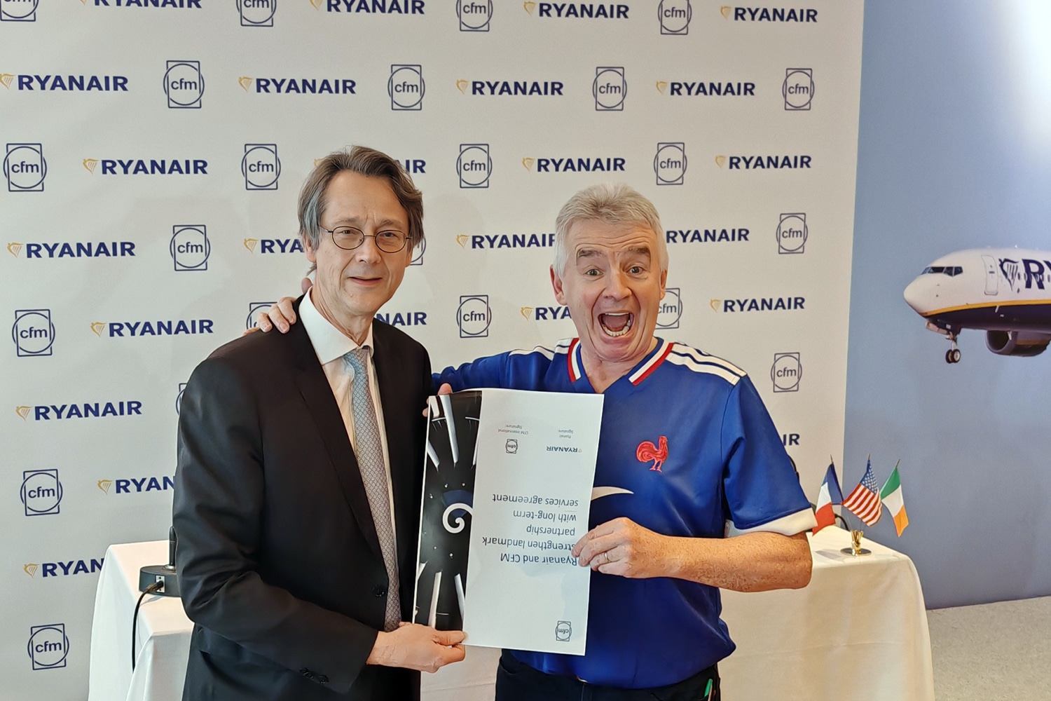 Michael O’Leary était assurément en forme le 10 février au siège de Safran, avec son maillot de l’équipe de France de Rugby, histoire de demander quelques concessions à Olivier Andries, le directeur général de Safran, suite à la défaite du XV du Trèfle quelques jours plus tôt. Le géant du low-cost européen a ainsi signé un protocole d’accord (MoU) de services de plusieurs milliards de dollars pour couvrir l’ensemble des moteurs de la flotte de la compagnie aérienne irlandaise pour les 15 prochaines années. À lui seul, l’accord d’approvisionnement de pièces (pièces de rechange et réparations de pièces) qui soutiendront les deux futurs shops moteurs de Ryanair pourra représenter plus de 1 milliard de dollars par an selon la compagnie irlandaise. Il faut dire que l’accord couvrira à terme près de 2000 moteurs au total si les options concernant les 150 derniers Boeing 737-10 étaient exercées.