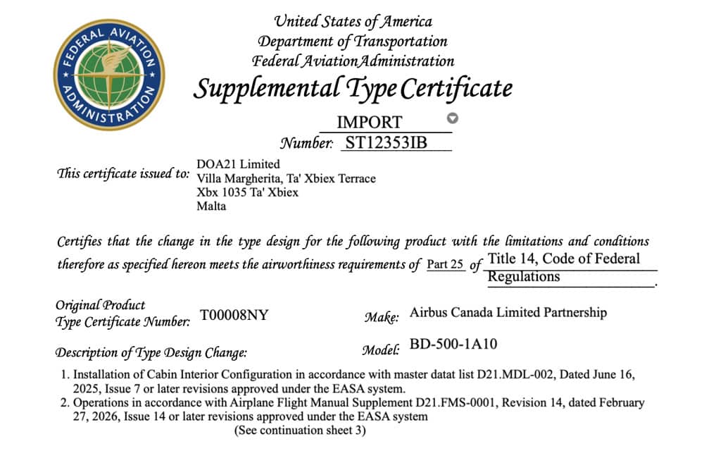 Filiale du groupe, basé à Malte, DOA21 est un organisme de conception agréé par l’EASA, qui propose notamment des modifications sur mesure d’aéronefs dans divers domaines (structure, électricité, avionique, systèmes de contrôle de l’environnement). Il est également capable de délivrer des certificats de navigabilité et des autorisations de vol. Avec le STC accordé par la FAA, il va pouvoir certifier les modifications de conception des cabines des ACJ TwoTwenty conformément à la réglementation américaine.