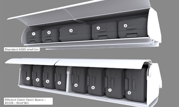 ECOS (Efficient Cabin Open Space) avait été présenté en 2017 par Zodiac Aerospace, après plusieurs évolutions de son précédent démonstrateur ISIS. Il s’agit d’un système pivotant de coffres à bagages plus spacieux, permettant de stocker les valises cabine en position latérale et roulettes à l’avant. Offrant un seuil plus bas qui améliore la visibilité, il fait gagner jusqu’à 60% d’espace de rangement. La structure, complètement revue avec de nouveaux plafonds et panneaux de jonction, est renforcée et le système de fermeture est plus facile à manipuler. Malgré cela, l’installation est rapide et ne nécessite pas de modification de l’avion. De même, l’agrandissement de l’espace dédié aux bagages ne se fait pas aux dépens de l’espace au-dessus du passager grâce au design des coffres.