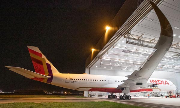 Le premier Airbus A350-900 (MSN 592) destiné à Air India est sorti de son atelier de peinture à Toulouse la semaine dernière, arborant la nouvelle livrée de la compagnie indienne.