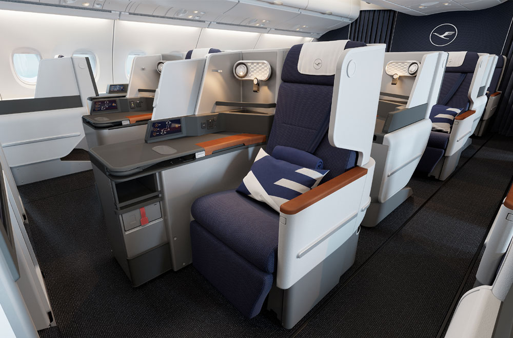 Pour ses A380, Lufthansa a renoncé à sa classe affaires Allegris, installée sur A350 et Boeing 747-8, pour des questions de durée de certification. Elle a ainsi opté pour un fauteuil dérivé du Vantage XL de Thomson, déjà certifié et en service sur A380, chez Qantas. Large de 58 cm et se déployant en lit horizontal de deux mètres, il offrira un accès direct au couloir à chaque passager – contrairement à la cabine actuelle, en 2-2-2 – et sera équipé de panneaux flexibles pour laisser le choix du degré d’intimité.