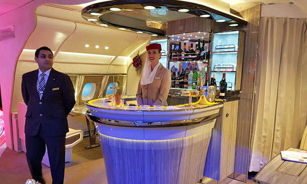 Emirates avait annoncé en février qu’elle allait installer un nouveau bar dans ses A380. En attendant son entrée en service au mois de juillet sur l’un des A380 dont la compagnie attend la livraison, il a été présenté grandeur nature le 8 mars au cours du salon touristique ITB, qui se déroule à Berlin jusqu’au 10.