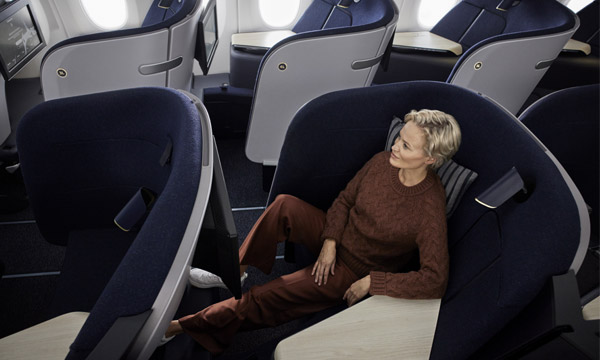 Finnair a décidé de repenser totalement sa classe affaires. Pour cela, elle a collaboré avec Collins Aerospace et lancé le nouveau fauteuil AirLounge. La principale nouveauté de ce fauteuil est de parier sur un dossier fixe, sans mécanisme d’inclinaison. En jouant sur les contours et les courbes de ce dossier, qui se fond avec l’ensemble de la coque, l’espace est agrandi puisque le passager peut l’utiliser dans sa totalité, s’asseoir selon différents angles, en fonction de son confort, et ajuster sa position avec les coussins.