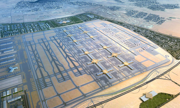 Mais le plus gros reste à venir. A la fin du mois, Dubai Airports lancera l’appel d’offres pour la première phase d’expansion majeure de l’aéroport Al Maktoum. Lorsqu’elle aura été achevée, la plateforme abritera trois pistes d’atterrissage parallèles de 4,5 km de long, utilisables simultanément, capables de recevoir l’A380 et dotées d’une instrumentation ILS IIIB permettant les atterrissages par visibilité réduite. Un terminal ouest sera fonctionnel et couvrira une surface de 165 000 m², pour une capacité de 35 millions de passagers. Deux satellites y seront reliés, chacun d’une surface de 385 000 m², d’une capacité de 65 millions de passagers et offrant une centaine de parkings avions, la moitié adaptée aux très gros-porteurs. Les satellites seront reliés au terminal Ouest par un métro avec sept arrêts (un dans le terminal principal et trois par satellite).