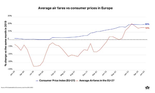 Avec une offre encore un petit peu contrainte et une demande qui n’a pas encore montré de signes de faiblesse, les tarifs aériens restent à un niveau plus élevés qu’avant la crise sanitaire. Les compagnies aériennes françaises indiquaient récemment qu’elles « pouvaient enfin facturer le coût réel du transport aérien à leurs passagers », qui s’est lui aussi alourdi avec l’inflation, la hausse du carburant et les difficultés de la chaîne d’approvisionnement. L’IATA a analysé l’évolution de ces tarifs et constate qu’ils ont tout de même augmenté moins vite que l’inflation en Europe.