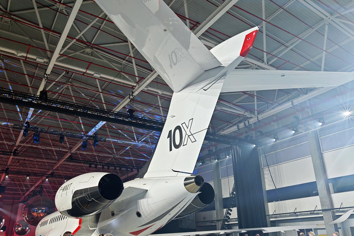 The 10X rollout took place in a new 26,000 m² building that will be dedicated to its final assembly in the coming years, in the presence of around 400 guests, including customers, prospects and industrial partners to the program. The aircraft on display was aircraft number 2; two jets are now fully assembled and two more are in the assembly phase. The latter will feature fully completed cabins and will take part in testing of interior systems and their maturation during an endurance flight campaign to all corners of the world ahead of entry into service.